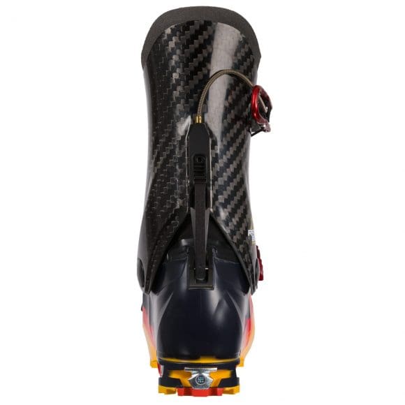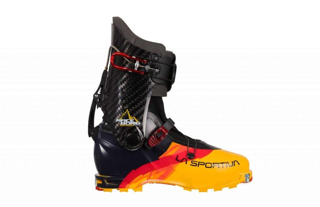 Gli scarponi La Sportiva Raceborg sono di colore giallo e nero con mobilità è a 75° (35° posteriormente/40° frontalmente), mentre l’inclinazione del gambetto ha 4 posizioni (14°, 16°, 18°, 20°). Si chiude con due ganci e pesa 760 grammi. Le misure disponibili sono dal 23.5 al 30, ma sono comprese le mezze misure. La suola è la La Sportiva RaceGrip™ compatibile con normative ISMF, e lo scarpone è compatibile con attacchi TECH.