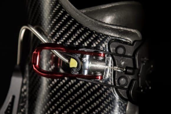 8. CavoBike Lever PRO™: sistema ski/walk brevettato con cremagliera posteriore integrata nel meccanismo di blocco/sblocco che ne permette il ribaltamento totale svincolando totalmente il gambetto per massima libertà di movimento anche con ramponi.