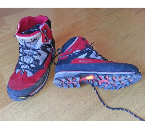 Lo scarponcino Dolomite Civetta Pro GTX è una classica calzatura da montagna. Si distingue per gli ampi inserti di colore rosso acceso, intervallato dal grigio chiaro e nero. Nonostante la linea non troppo moderna i materiali utilizzati e il confezionamento sono comunque dei migliori: Vibram, Gore-Tex, passanti in metallo. Sorprendentemente leggera, nonostante le dimensioni. La suola è abbastanza rigida sia in torsione che in flessione; il tacco è piatto e rialzato rispetto al resto mentre anteriormente la suola prosegue con una piccola protezione sulla punta; il marchio Vibram infine ne garantisce la qualità. L'intersuola ha tre colori e densità diversi. Il perimetro dello scarpone è totalmente circondato e protetto da una fascia gommata alta 3 cm. Il tallone è rinforzato in tessuto plastico, mentre gli inserti rossi sono in pelle scamosciata. I laccetti sono classici, tondi e bicolori mentre i passanti sono tutti metallici, i primi 4 ad anello (senza carrucola) e gli ultimi 2 superiori a gancio, ma non bloccanti. La linguetta è ben imbottita e presenta un'ulteriore protezione esterna dove i lacci vanno a premere maggiormente sul piede una volta tensionati. Anche il collare è ben imbottito e un laccio posteriore è inserito per facilitare la calzata. La membrana in Gore-Tex è ben assemblata e aderisce perfettamente con la tomaia esterna; tre le cuciture interne, una sul tallone due oblique sui fianchi. La soletta è molto sottile ed è sagomata sul tallone. La calzata risulta semplice e veloce: il serraggio dei lacci è immediato ed efficace anche se sarebbe stato utile un sistema di bloccaggio sulla penultima fila di ganci per favorire la tensione ottimale dei laccetti. Si nota subito troppo spazio intorno alle dita: l'allacciatura non parte dalla punta e il tensionamento in questa zona del piede è limitato. Comode e confortevoli. (Stacchini Riccardo)