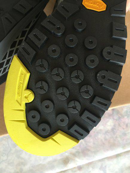 Il battistrada Vibram Gravity (studiato appositamente per questo modello) è composto per la maggior parte dalla famosa mescola Megagrip, dall’alto potere aderente, mentre al tallone e in una ampia porzione anteriore notiamo gli inserti di diverso colore in Idrogrip, combinazione di gomme appositamente studiata per i terreni umidi e bagnati. L’osservazione esterna si completa con il sistema di chiusura a lacci esteso fino in punta, tipicamente da arrampicata, con laccio in tessuto ruvido e cavo all’interno, fori passalaccio nella tomaia senza anelli metallici (eccetto la coppia superiore) che fanno presumere una buona capacità di “memoria” durante la fase di trazione del laccio, dalla punta al collo del piede.
