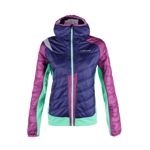 Exodar Jacket di La Sportiva attira l'attenzione per i suoi colori, nel nostro caso Iris blu/purple e anche non conoscendola dà idea di essere leggera e tecnica. Infatti andandola poi a tastare e analizzandone i particolari si può confermare quanto immaginato solo a vederla. La giacca ha una particolare costruzione, in VapoVent, composto da una struttura a sandwich a 3 strati: lo stato esterno in materiale idro-repellente, l'imbottitura isolante in Primaloft Silver Active e lo strato interno in materiale altamente traspirante, tutta questa costruzione è adatta a zone ad alta sudorazione perchè permette una traspirazione ottimale, facendo uscire l'umidità. Nelle zone "critiche" quindi sotto le braccia e sui fianchi è ben elasticizzata in modo da permettere grande libertà di movimento, vista anche la sua attitudine principale per lo sci alpinismo, anche se è adattabile a diverse attività outdoor come il trekking, lo sci da discesa, lo sci di fondo e tanto altro ancora, perchè la si può usare sia come giacca sopra la maglia termica, sia come strato, sotto un guscio o una giacca da sci. Il cappuccio è integrato e sufficientemente grande da non creare fastidio, inoltre è presagomato e pensato anche ad utilizzi con il casco ed è dotato di un visierino. Esternamente ci sono due tasche abbastanza spaziose a chiusura con una zip; sulle spalle e sul fondo schiena ci sono rinforzi anti-abrasione. All'interno della giacca, sul profilo della vita, c'è una banda di silicone elastica per permettere la massima aderenza. Inoltre c'è una tasca con chiusura a zip e il foro appositamente creato per il passaggio delle cuffie, oltre che una tasca senza chiusure specifiche. Exodar Jacket è comprimibile e quindi per niente ingombrante, infatti può essere tenuta in piccoli spazi ed è molto comoda da mettere in zainetti o legarla in vita. E' disponibile in tre colori: Iris blue/purple, Emerald/iris blue, Mint/emerald Al tatto ma ancor più indossandola si sente la sua morbidezza questo fa sì che si adatti al corpo contribuendo ad una formidabile silhouette.