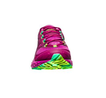 La Sportiva Lycan Wm's 2018 è una calzatura da trail running dal colore porpora acceso con la scritta La Sportiva che risalta in giallo acido. La tomaia traforata suggerisce un'ottima ventilazione, sono presenti inoltre alcuni inserti in microfibra spalmata anti-abrasione di color porpora più scuro che attribuiscono resistenza e struttura alla calzatura. Presa in mano è abbastanza leggera con volumi ben proporzionati; alle torsioni rimane sufficientemente rigida. Internamente il plantare è un Ortholite Mountain Ergonomic da 4 mm Il sistema di chiusura a lacci è ben studiato con i passanti in materiale sintetico ben distanziati tra loro. Sul retro della calzatura c'e un comodo lacciolo che faciliterà la calzata. L'intersuola ad iniezione (EVA) con ulteriori strutture esterne, garantisce una buona ammortizzazione, presente inoltre una zeppa che attenua l'impatto durante l'utilizzo. Il battistrada rock-ground dai colori fluo e con tecnologia impact brake system suggerisce un ottimo assorbimento degli impatti. Sulla punta è presente un puntalino protettivo in TPU che tutelerà il piede da eventuali collisioni con corpi esterni. E' una calzatura che dà idea di affidabilità. Non resta che provarla!!