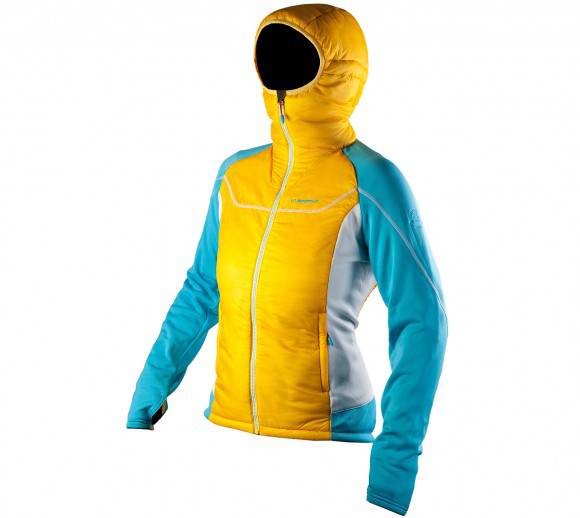 La Sportiva Siren Hoody JKT W presenta dei colori molto vivaci sia all'interno che all'esterno. La sua costruzione presenta due diversi tipi di tessuto: per le maniche e fianchi, tessuto Power Dry, mentre per il petto, dorso e testa, un tessuto PrimaLoft, resistente all'acqua, soffice e comprimibile, per proteggere quelli che sono gli organi vitali. E' presente una coulisse per personalizzare il cappuccio a livello della nuca e un'altra per regolare la giacca a livello del bacino. Le cerniere a maglia stretta, sono molto scorrevoli, quella centrale arriva a chiudersi fin sotto gli occhi, grazie alla piega verso l'esterno della patella, con l'interno vellutato per evitare abrasioni sul viso. Nella parte interna sinistra c'è un taschino con zip e foro per auricolare e un'asola blocca fili. Le cuciture esterne sono piatte, mentre i polsi elasticizzati sono dotati dell'alloggiamento del pollice per evitare risalite di maniche. Indossandola si percepisce una sensazione di avvolgimento e di protezione dal freddo e dal vento.