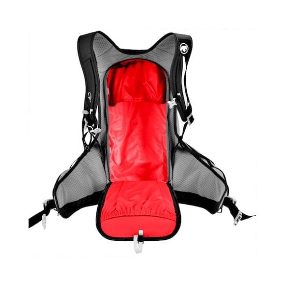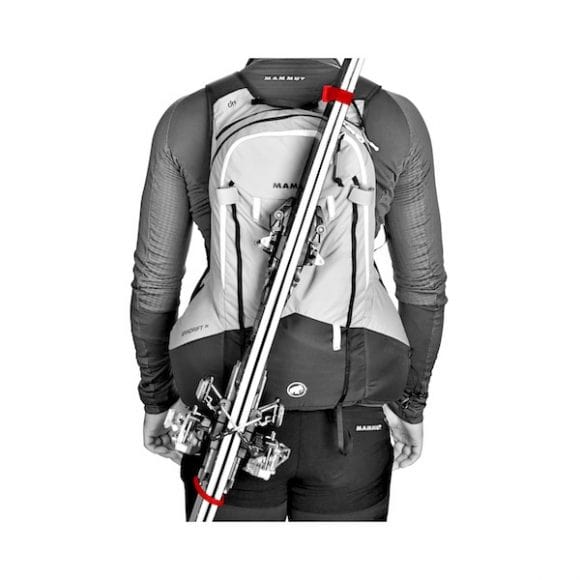 Il Mammut Spindrift 26 colpisce l'occhio per la sua forma inconsueta che ricorda più una vest da trail running eppure è uno zaino da scialpinismo al 100% con una capienza di 26 litri che riesce a contenere senza problemi il kit anti-valanga e tutto l'occorrente per una lunga giornata tra pelli e pendii. Mammut ha creato tutta la nuova linea Spindrift, declinata in 3 volumi (14, 26 e 32 litri), con l'obiettivo di soddisfare le richieste degli scialpinisti moderni che interpretano la disciplina in maniera fast&light. L'obiettivo é quello di non doversi togliere mai, o quasi mai, lo zaino per prendere gli accessori di uso più frequente. Ecco spiegata la forma del Mammu Spindrift 26, che ha un vano principale associa due grandi tasche laterali all'altezza del cinturone. Proprio in queste due tasche abbiamo riposto senza difficoltà 2 pelli per un paio di sci da 170cm e 85mm sotto al piede, un telefono cellulare (nella tasca destra é presente un vano specifico), un paio di guanti di riserva e una fascia in pile, più un paio di barrette. Oltre alle due tasche laterali con zip, sempre tenendo lo zaino sulle spalle si raggiungono senza fatica due tasche in rete elasticizzata, perfette per gel energetici, barrette o cartine. Durante la marcia in salita il Mammut Spindrift 26 rimane ben fermo sulla schiena, anche quando caricato al massimo non da la sensazione di spingere sulla schiena e soprattutto non ondeggia a destra e sinistra quando si spinge forte sui bastoncini per affrontare i tratti più ripidi. Le due larghe tasche laterali non ingombrano con il movimento delle braccia e il cinturone riesce a sostenere bene il peso distribuendolo tra le spalle e il bacino. Oltre alle tasche laterali il Mammut Spindrift 26 è davvero un concentrato di scomparti per il trasporto di tutto il necessario per una giornata di skitouring: porta casco esterno, punto di aggancio per bastoncini sullo spallaccio destro, una chicca che permette di affrontare in sicurezza e senza il rischio di perdere i bastoncini i brevi tratti di progressione su roccia che spesso si incontrano nelle uscite più impegnative. Nello spallaccio sinistro si nasconde un comodo alloggiamento per la borraccia, perfetto anche per le borracce con cannuccia tanto amate dai trail runners e skimo racer. Nella parte esterna c'é un doppio punto di aggancio per piccozze oppure per una piccozza e un paio di bastoncini telescopici. La tasca destinata ad alloggiare pala e sonda presenta anche un piccolo vademecum su come comportarsi in caso di incidente in montagna. Sembra davvero non mancare nulla in questo zaino. Il porta sci diagonale con anello nella parte bassa a sinistra è facile da utilizzare anche con sci dalle dimensioni generose (noi abbiamo usato un paio di Blizzard ZeroG 85). Molto pratico per chi ha già confidenza con i sistemi di trasporto diagonali in stile race, ma che richiede poco tempo e qualche sessione di pratica per prenderci la mano. Durante le fasi di discesa il Mammut Spindrift 26 si è comportato egregiamente, sempre ben fermo sulla schiena e anche quando siamo caduti rotolando più volte su noi stessi non si é sfilato e tutto il materiale é rimasto al suo interno. Il suo volume da 26 litri ci ha permesso di portare con noi una giacca in GoreTex, un gilet in piumino, una maglia intima di riserva, una lampada frontale, un mini-imbrago da skialp, discensore, moschettone e un paio di chiodi da ghiaccio, insomma tutto il corredo per una lunga giornata in montagna più un gustoso panino ben imbottito per regalarci una soddisfazione una volta arrivati in cima. Volendo é possibile agganciare la sacca porta ramponi nella parte alta all'esterno così come legare all'esterno anche un cordino in Kevlar® per eventuali calate.
