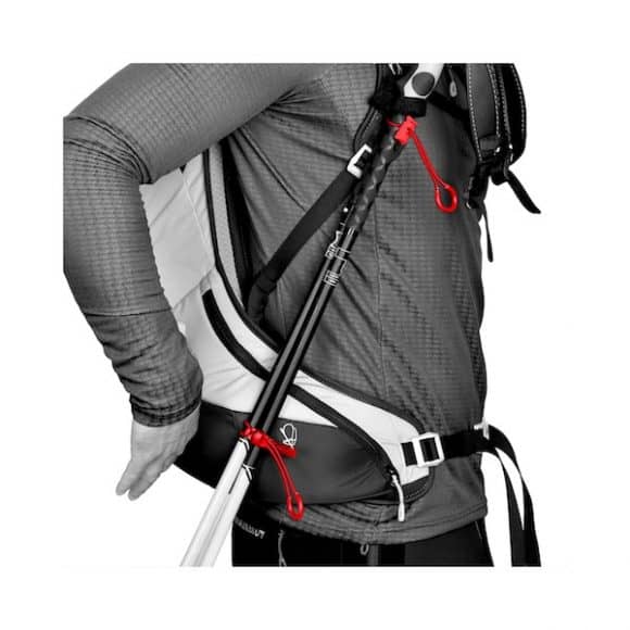 Sistema di trasporto | Sistema porta sci diagonale con cordino inferiore; Porta piccozza e porta casco, vano porta pelli, porta bastoncini, portaborraccia e porta piccozza |