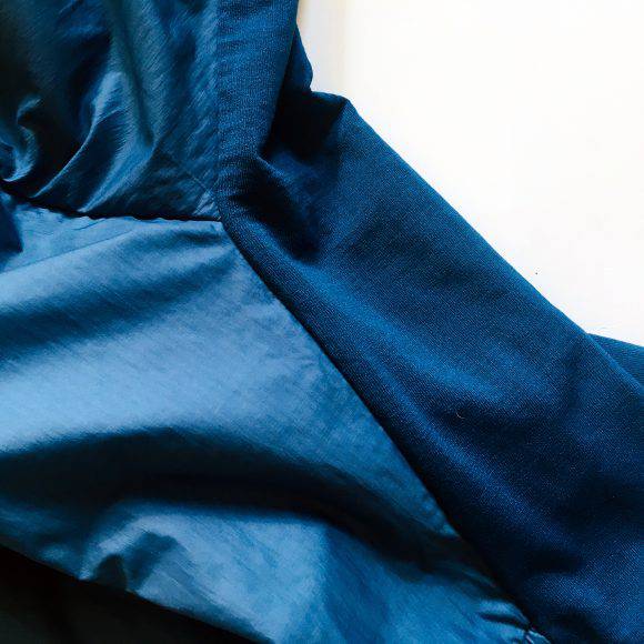 Salewa Pedroc Polartec Alpha jacket, tessuto Alpha combinato con Power Dry sempre di Polartec. Si tratta di un strato parzialmente termico, cioè termico laddove è stata inserita l’imbottitura Alpha, quindi zona anteriore del petto, dello stomaco e zona delle spalle, quindi dove l’aria può penetrando creare delle problematiche. In base alla costruzione bodymapping, tipica di Salewa, i tecnici hanno pensato di posizionare in queste aree questa imbottitura, ben sapendo che Alpha è anche traspirante. Nelle parti in cui invece c’è necessità di raffreddamento e traspirazione hanno inserito il Power® Grid™, che è un altro tessuto Polartec che veicola grazie alla sua tassellatura molto rapidamente il sudore interno verso l’esterno. La combinazione dei due tessuti fa si che il capo risulti termico, risolvendo l’abbassamento della temperatura dovuto al freddo e al vento, senza accumulo di calore e quindi favorendo la traspirazione. Salewa Pedroc Polartec Alpha jacket presenta un’ingegnerizzazione la più vicina possibile all’ergonomia del corpo. Le maniche sono imbottite in Alpha fino all’altezza del gomito, mentre l’avambraccio è in Power dry per essere più agevole. Il polsino è allungato ed elasticizzato per garantire chiusura e coibentazione a livello del polso, con incavo per il pollice per poter estendere la copertura fino a metà della mano e stabilizzare il capo anche indossando strati superiori. Posteriormente abbiamo una lunga fascia centrale sulla colonna di Power dry, mentre ai lati, zona renale e zona alta dorsale e lombare abbiamo l’imbottitura in Alpha per garantire calore. Frontalmente abbiamo una zip completa che arriva fin davanti al mento con un collo di alto spessore in Power dry raddoppiato, e nella parte sottostante ha una patella antivento. Tutta la zona dello stomaco e dell’intestino sono protette da Alpha, mentre lateralmente la traspirabilità potente del Power dry. Ai lati ci sono due tasche di media dimensione. Il trattamento della parte con Alpha è leggermente idrorepellente, quindi non è un capo da usare in caso di pioggia, ma può bastare anche da solo con una pioggerellina sottile. In caso di pioggia quindi va abbinato a un guscio o a un softshell idrorepellente. La parte anteriore delle maniche aderisce perfettamente all’avambraccio e quindi dà una sensazione immediata di comfort e calore, la manica scorre bene e possiamo mettere il pollice nel suo incavo per stabilizzare la risalita della manica. Andiamo a chiudere la cerniera: c’è una la coulisse elastica in basso, il taglio è lungo e copre i glutei e il basso ventre. La vestibilità è piacevole e consente di fare ogni movimento in libertà senza che nulla si sposti: movimenti anteriori, innalzamento delle braccia, iperestensioni, senza che il capo si muova.
