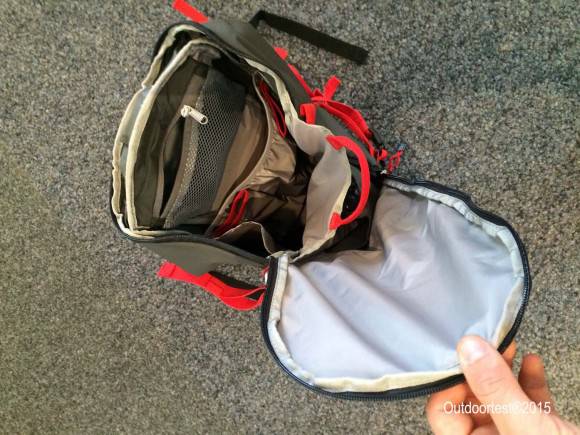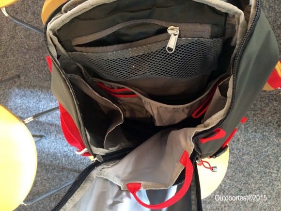 Lo zaino aperto presenta notevoli scomparti di diverse dimensioni, sulla parte superiore un'astuccio in rete di piccole dimensioni con chiusura a zip. Lo zaino risulta molto facile da caricare e da organizzare internamente. Le cinghie di regolazione sono molto funzionali e mantengono lo zaino aderente al corpo garantendo una perfetta distribuzione dei carichi.