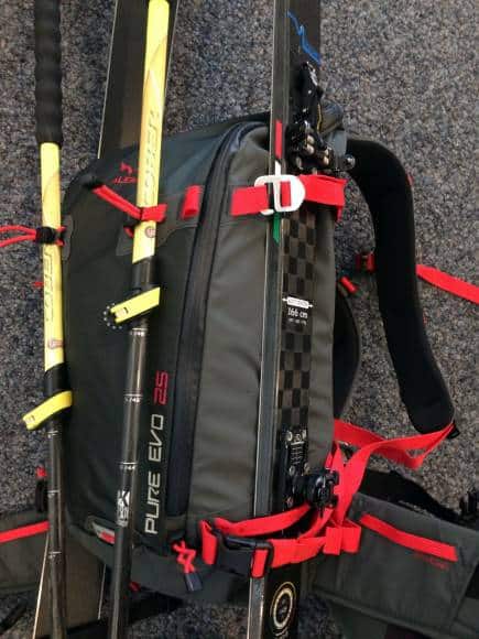 A ciascun lato della barretta sono disposte due cinghie analoghe a quelle sopra per il trasporto degli sci, una regolabile con clip in plastica e una fissa cucita in tessuto. Gli spallacci sono gommati e dotati di chiusura a clip sul petto , regolabile perchè scorrevoli su una guida. La clip di chiusura sul petto funge anche da fischietto di emergenza.