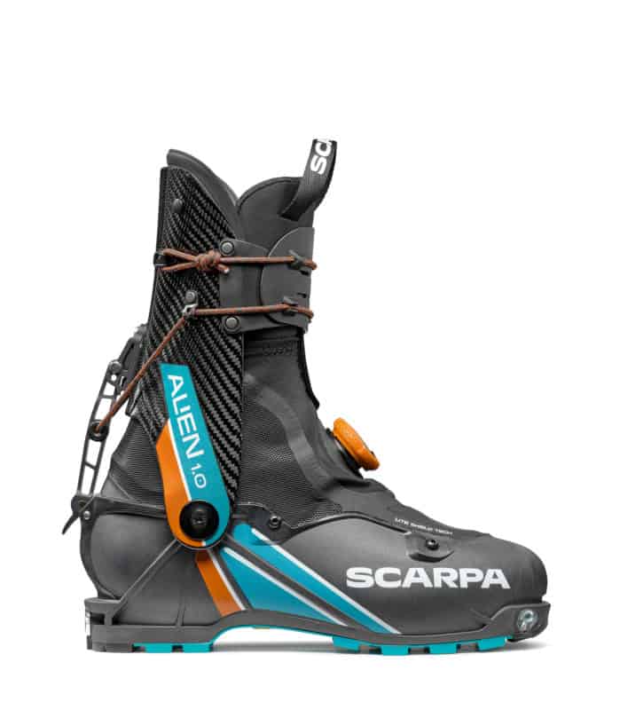 La chiusura superiore dell' Alien 1.0 carbon di SCARPA è formata da due alette fissate al gambetto, dotate di alloggiamenti dove viene posizionato un cordino in kevlar che, tramite un asola, può essere chiusa ad una distanza a piacimento dell'utilizzatore. Questo permette di aprire o chiudere l'escursione del gambetto.