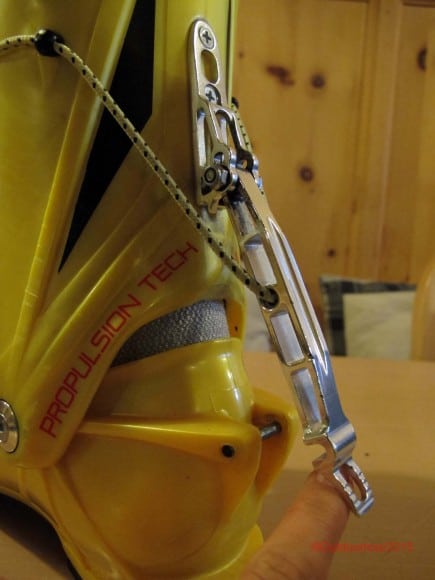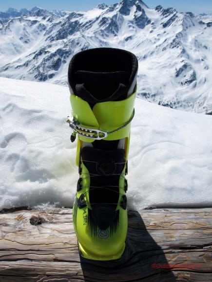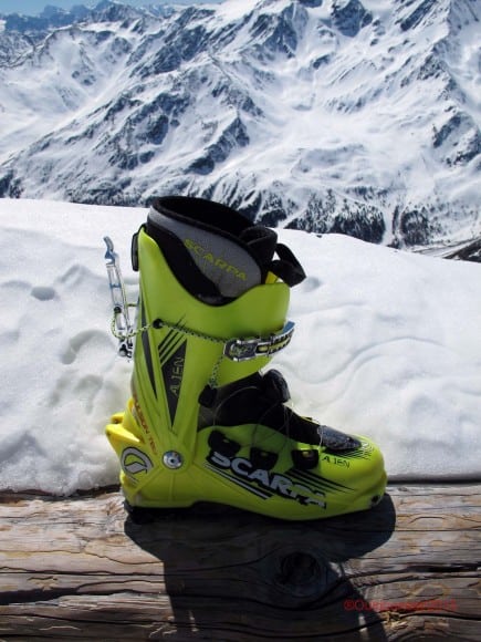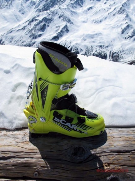 Alien di Scarpa, a prima vista risulta un modello molto tecnico e leggero. La tecnologia al suo interno è elevata e rimarremo positivamente colpiti da come in così poco peso (850g.) si possa sciare! Lo scarpone è costituito da uno scafo per il piede alleggerito in volume e dimensione sopratutto nella parte del collo, e di un gambetto costituito da una parte che copre il retro caviglia ed una fascia per stringere la zona della tibia. Il sitema di chiusura si chiama "Speed Lock" con leva A-light e cordino in Dynema, questo permette il bloccaggio superiore nell'area tibiale ed al contempo l'aggancio al gambetto dello scafo per la fase di discesa in maniera pratica e veloce, evitandoci di dover agganciare tutti i ganci. Una volta indossato la sensazione è subito piacevole e comfortevole, nella posizione walk è impressionante l'escursione della caviglia nel passo e non sembra neanche di indossare uno scarpone. La scarpetta al suo interno è molto leggera e fasciante, termoformabile e dotata di velcro nella parte alta per renderla più aderente. La chiusura della parte dell' avanpiede è affidata al sistema boa, che con una rotella ed un sistema di tiranti ci permette di stringere e personalizzare la scarpa il più possibile. La suola è in Vibram UFO e permette una buona rullata e grip su tutti i tipi di terreno, permettendo massima sensibilità.