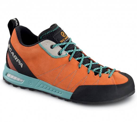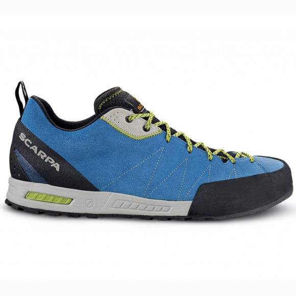 Gecko di SCARPA è un prodotto dal look molto sobrio, minimale, di tendenza, quasi "fashion", nonostante la sua destinazione "approach", quindi tecnica. La tomaia è realizzata in pelle scamosciata (il nostro modello in colore Blu elettrico), con trapuntature estetiche esterne laterali, fascione protettivo in gomma anteriore con prolungamento sopra l'alluce (sembra essere davvero efficace, nonostante il profilo basso della suola); protezione gommata anche al tallone con una conchiglia rigida e contenitiva. Al di sotto, il sistema intersuola, suola, battistrada, un compound dall'aspetto solido e compatto con un inserto sotto al tallone in gomma di differente densità, per aumentare l'effetto cushoning, sopratutto in discesa. Il collarino superiore è ben profilato, con un incavo posteriore per alloggiare il tendine d'Achille, e presenta dell imbottiture interne sotto malleolari che creano un bell'invaso che accoglie in modo stabile la caviglia. Una volta calzata la scarpa è immediatamente fasciante, adatta ad un piede standard e magro, sembra un guanto, donando una sensazione molto piacevole fin dall'inizio. Il linguettone anteriore e discretamente ampio, realizzato in mesh (rete) traspirante, e ben si adatta al di sotto dei bordi della tomaia per favorire una chiusura (fino in punta) molto efficace. I lacci sono a struttura piatta, scorrono agevolmente nei passalacci (fori nella tomaia), presentano la giusta resistenza per fare in modo che, una volta eseguito il nodo semplice, non vi sia più bisogno di intervenire. Al di sotto della scarpa, un battistrada Vibram molto sottile (4 mm. ca), dotato di "climbing zone" anteriore. Nel complesso, un prodotto convincente a prima vista sul piano estetico, che instilla curiosità sulle sue potenzialità funzionali. non resta che provarla.