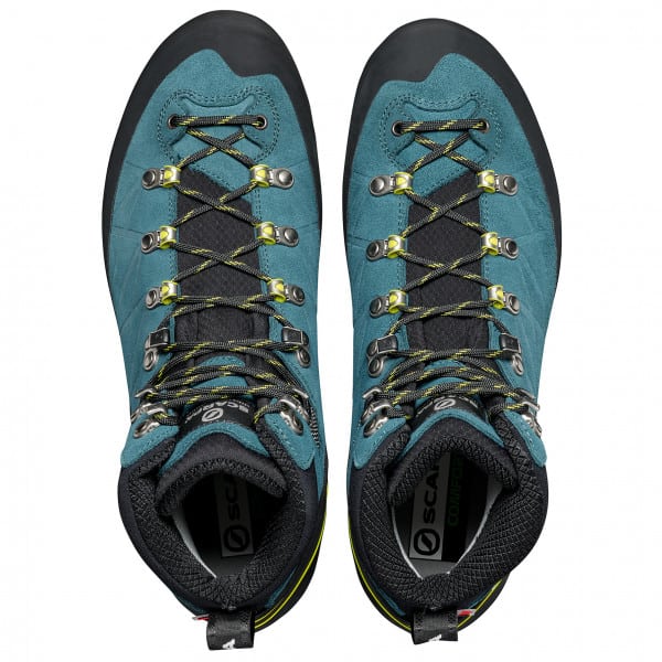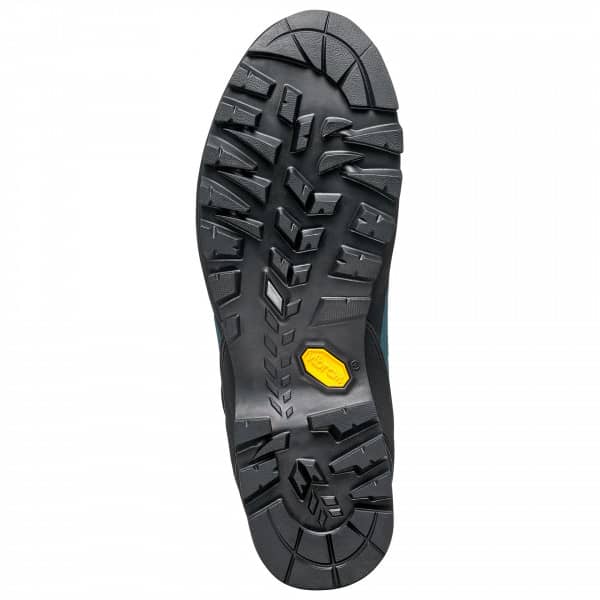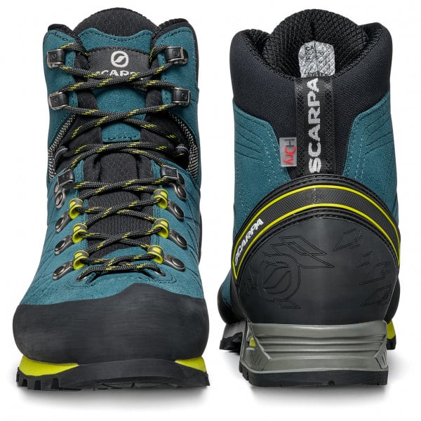 La tomaia è in pelle scamosciata trattata con prodotto idrorepellente, la tonalità blu petrolio e le linee in basso rilievo sono rappresentative della estetica di SCARPA. Il resto dei colori sono il nero delle parti in gomma e del tessuto sintetico e piccoli dettagli giallo fluo nell'intersuola e e nei passanti dei laccetti.