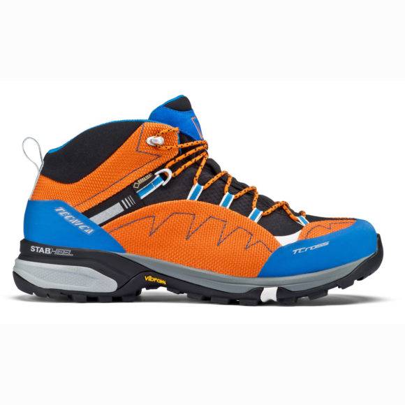 Il modello Tecnica T-Cross Mid Synthetic GTX MS ricorda, nell'abbinamento dei colori, lo scarpone da sci dello stesso marchio. Scarponcino di altezza media, leggero, probabilmente adatto per molteplici attività dalla primavera all'autunno, magari anche in inverno. Evidente il tessuto a trama grossa arancione, ma la prima impressione è quella di una usura precoce con utilizzo intenso. Protezioni gommate blu in punta e tacco, suola in Vibram XS Trek e membrana in Gore-Tex. L'intersuola è molto ben ammortizzata (la parte grigia) sia in punta che sul tacco dove è inserita una parte rigida nera "Stabheel" per conferire maggior stabilità sul tallone. I laccetti sono a sezione rotonda, 4 i passanti in tessuto abbinati ai 2 superiori in metallo senza strozzature. La linguetta è comoda in quanto ben imbottita: si posiziona bene e facilmente ma durante la tensione dei laccetti serve attenzione per riposizionarla correttamente. La soletta "Ortholite" è molto morbida, spugnosa e avvolgente sul tacco. L'asola posteriore posizionata sopra il tallone facilita la calzata. (Riccardo Stacchini)