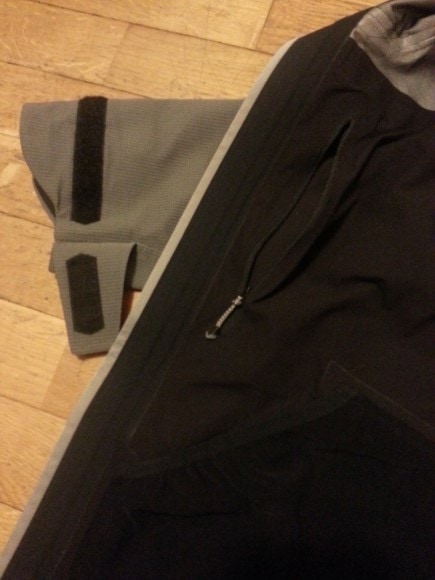 2 tasche principali ai lati ed una napoleonica a sinistra. All'interno troviamo 2 tasche aperte a rete ed una a cerniera per portafoglio o cellulare. Sotto le ascelle è presente un'apertura di aerazione a cerniera stagna con doppio cursore. La parte inferiore della giacca è regolabile tramite cordino elastico i cui capi sono posti all'interno delle 2 tasche principali. Per allentare la tensione si devono premere i 2 meccanismi a pulsante inseriti all'interno dell'orlo ai lati della cerniera principale, difficili da trovare velocemente. I polsi sono ergonomici e regolabili tramite una lingua a velcro.